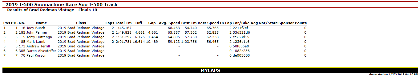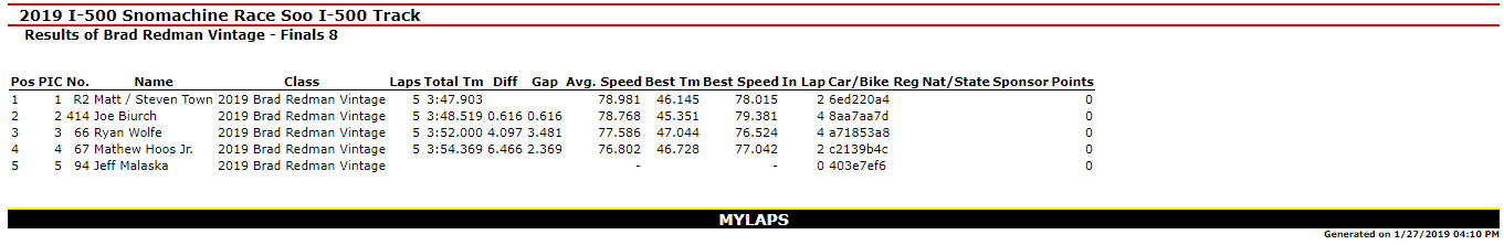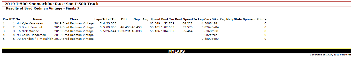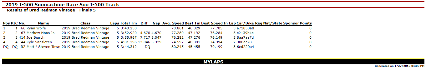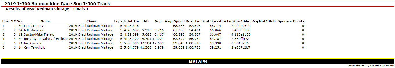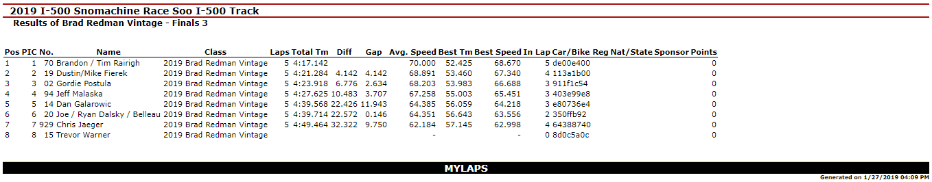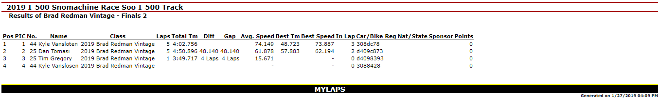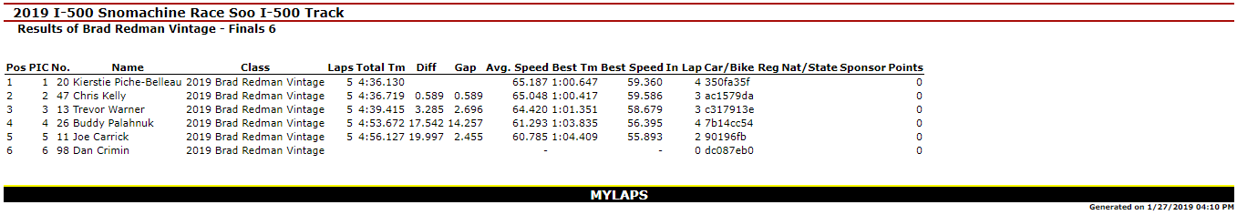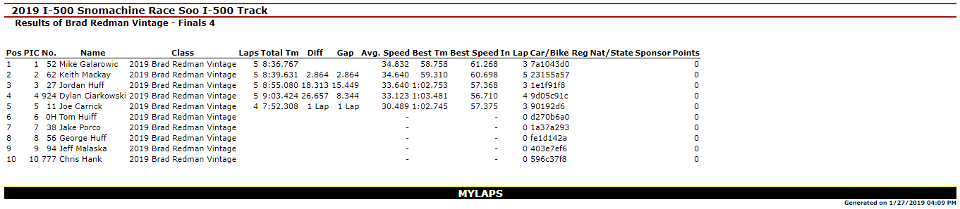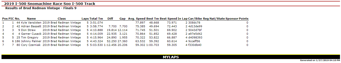 SAULT STE. MARIE, MI – Jan. 27, 2019 – Day I of the 51st Annual International 500 Snowmobile Race Week is Complete. Kyle VanSloten was the big winner of the day with Two Feature Wins (440 Free Air Super Stock & 340 Free Air Super Stock) in the Inaugural Soo Super Stock Shootout. Overall, he scored six Checkered Flags on the day as he won the 440 Fan Super Stocks A-Final and Three total Heat Races in Great Lakes Antique Snowmobile Series action on the 1-mile ice oval in Sault Ste. Marie, MI.
