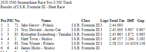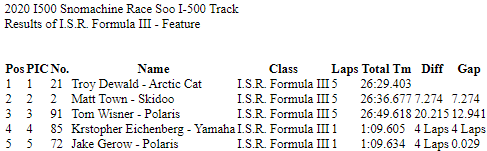 Troy DeWald, the three-time and defending International 500 Snowmobile Race Winner, added his name again to the #SooI500 record books by winning the Inaugural International Snowmobile Racing, Inc. (I.S.R.) Formula III Feature to kick off Opening Day / Bud Clarke Day at the 52nd annual International 500 Snowmobile Race.