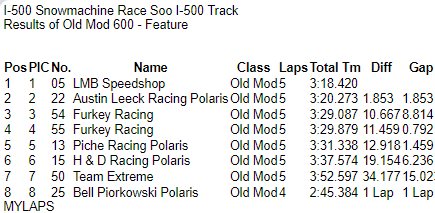 Andy Shoemaker Scored the Victory in the Kokosing-Alberici-Traylor Old 600 Modifieds Shootout III at the International 500 Snowmobile Race Track in Sault Ste. Marie,Michigan after a lengthy battle with Kokosing Solar Fast Qualifier, Austin Leeck