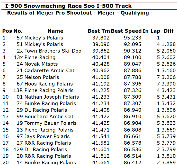 -Mile High-Banked Ice Oval with his lap of a 37.802 = 95.233mph on Wednesday, January 29th and that lap stood tall to take the Meijer Fast Qualifier Award