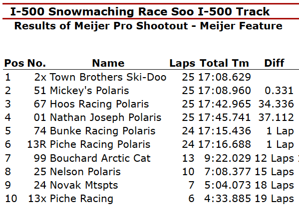 In an Instant Classic at the International 500 Snowmobile Race Track in Sault Ste. Marie, Michigan, Tyler Town battled tooth and nail with race longer leader, James Hicks, the Parker Ace Hardware #SooI500 Pole Award Winner, over the entire 25-Lap Feature